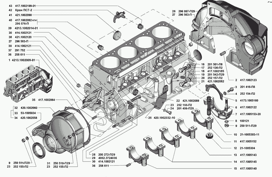 | 1 | 4213.1002009-01 | Блок цилиндров с крышками и картером сцепления в сбоpе |