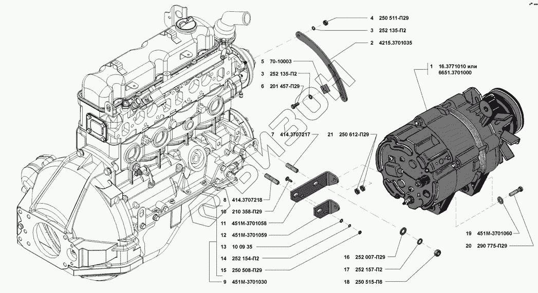 | 9 | 451М-3701030 | Кронштейн крепления генератора в сборе |