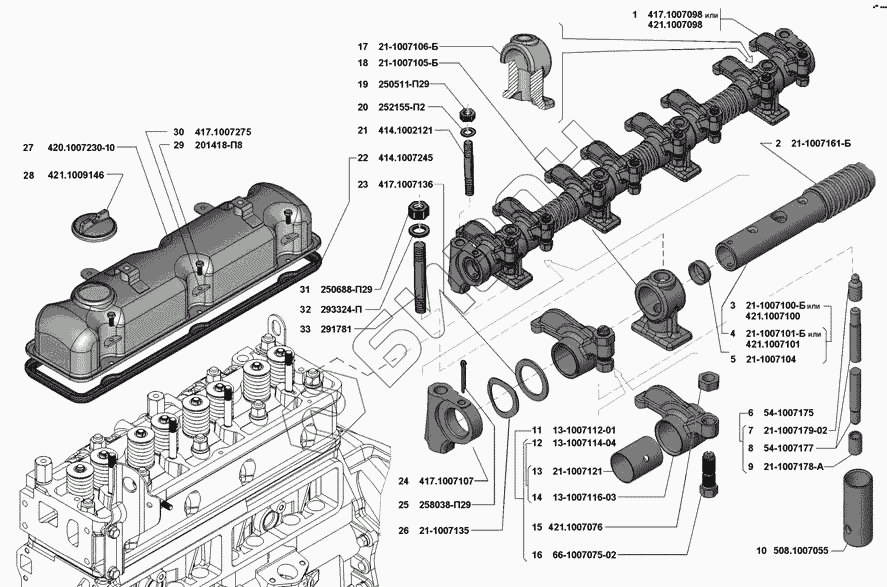 | 3 | 21-1007100-Б | Ось коромысел с заглушками в сборе |