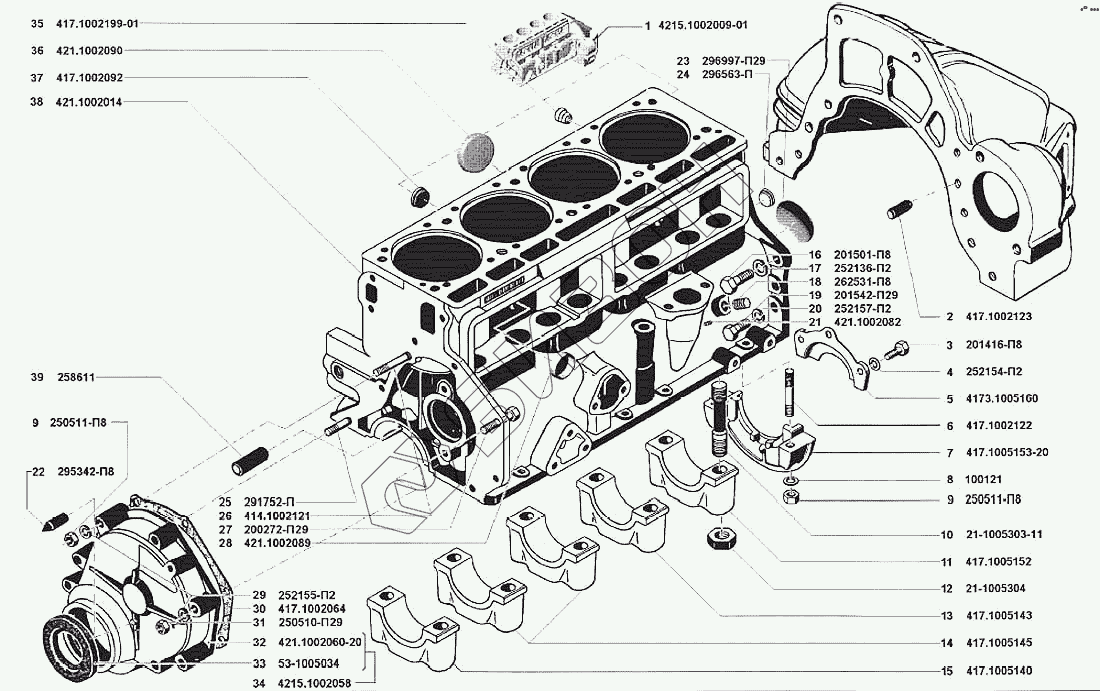 | 1 | 4215.1002009-01 | Блок цилиндров с крышками и картером сцепления в сборе |