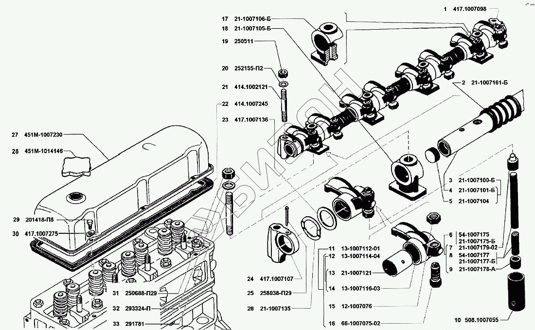 | 3 | 21-1007100-Б | Ось коромысел с заглушками в сборе |