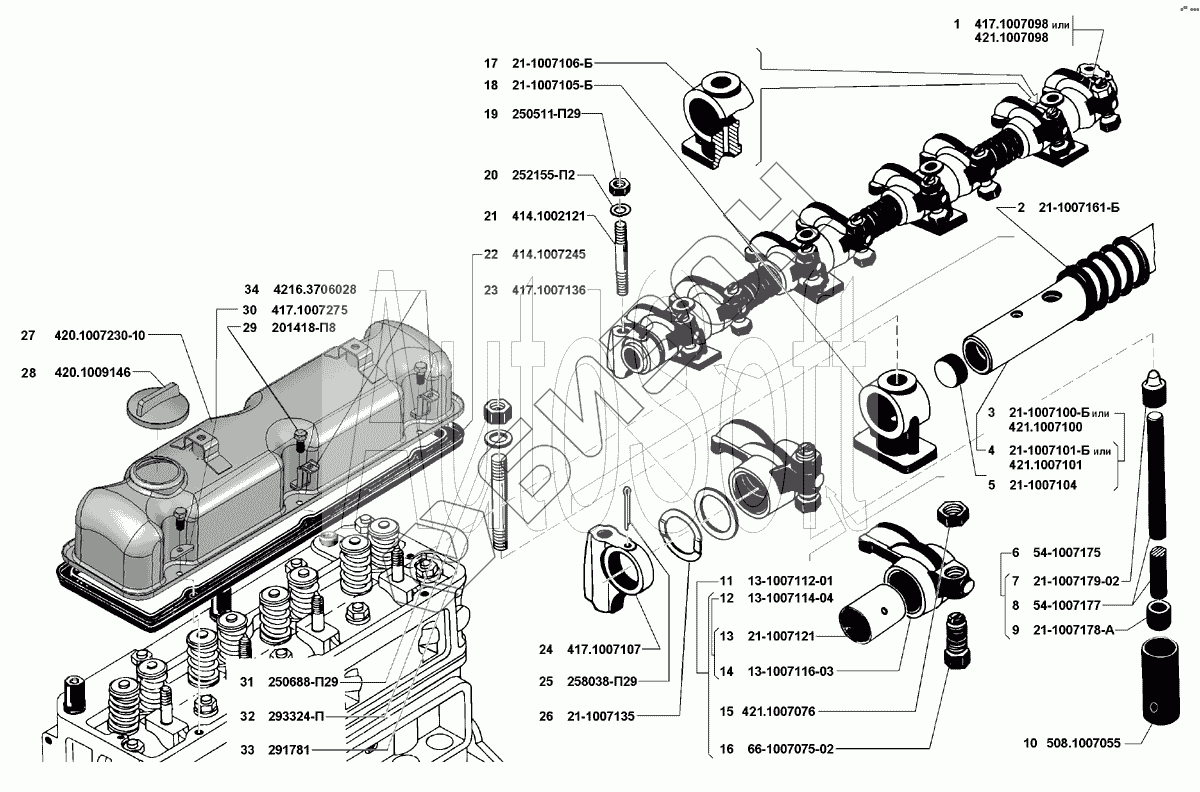 | 3 | 21-1007100-Б | Ось коромысел с заглушками в сборе |