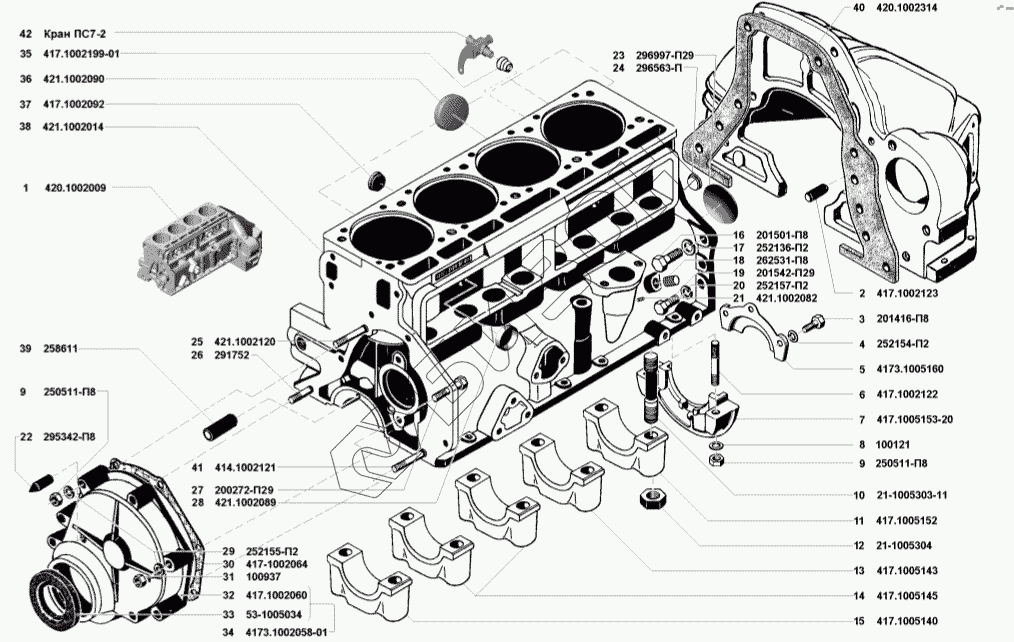 | 1 | 420.1002009 | Блок цилиндров с крышками и картером сцепления в сборе |