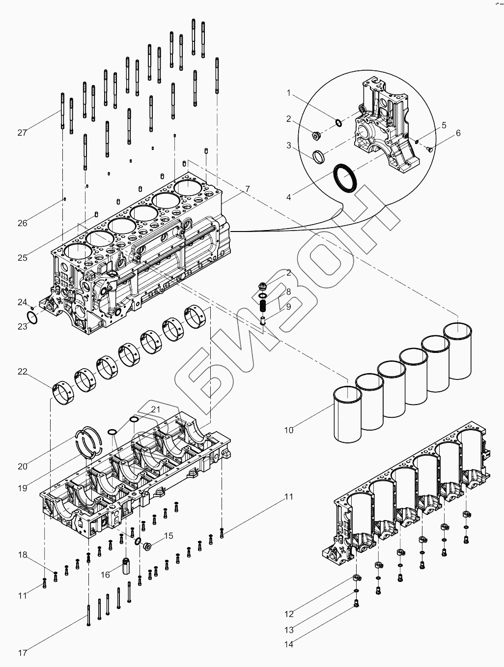Графический каталог запасных частей к технике: Weichai 6M11 DHM16D0006. Engine Block Group