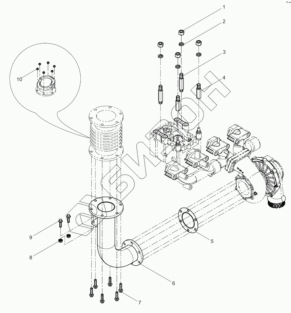 Графический каталог запасных частей к технике: Weichai 6M11 DHM16D0006. Rear Exhaust Manifold Group