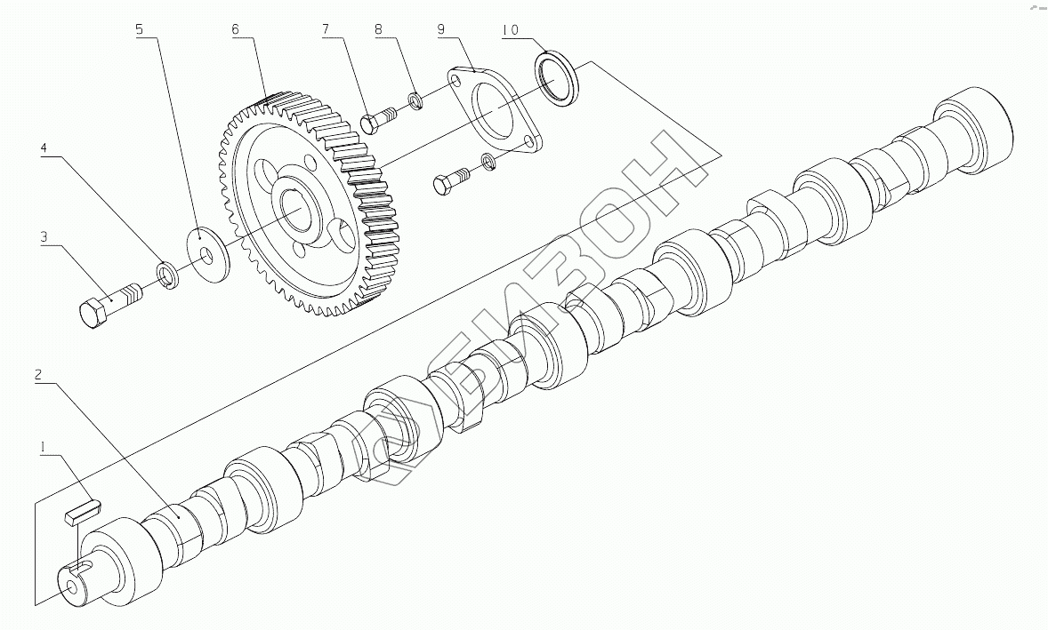 Графический каталог запасных частей к технике: Yuchai YC6B125-T11. 630-1006000A/02 Camshaft Assembly
