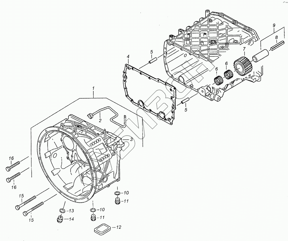 Графический каталог запасных частей к технике: ZF КПП ZF 16S1820. Установка картера сцепления