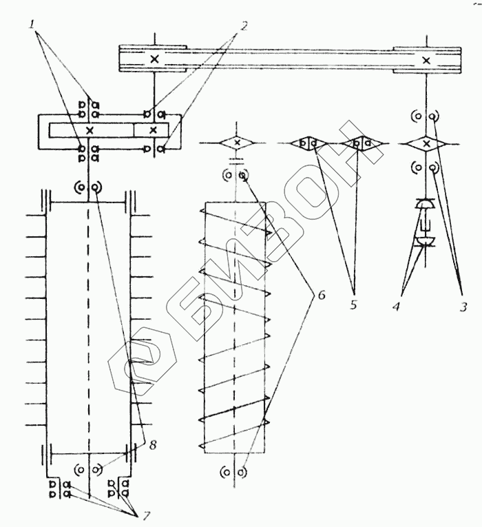 Графический каталог запасных частей к технике: Гомсельмаш КСК-100А. Схема расположения подшипников подборщика
