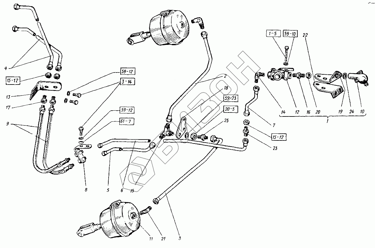 | 9 | 200-3506060-Б1 | Шланг к передним тормозным камерам гибкий в сборе |