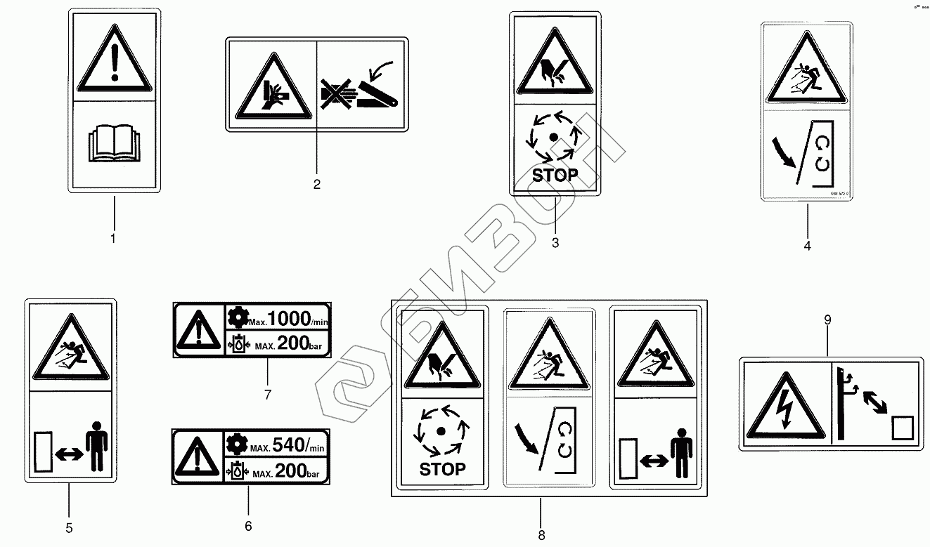 Графический каталог запасных частей к технике: KRONE 280CV-Q, 320CV-Q, 280CRI-Q. Warning signs