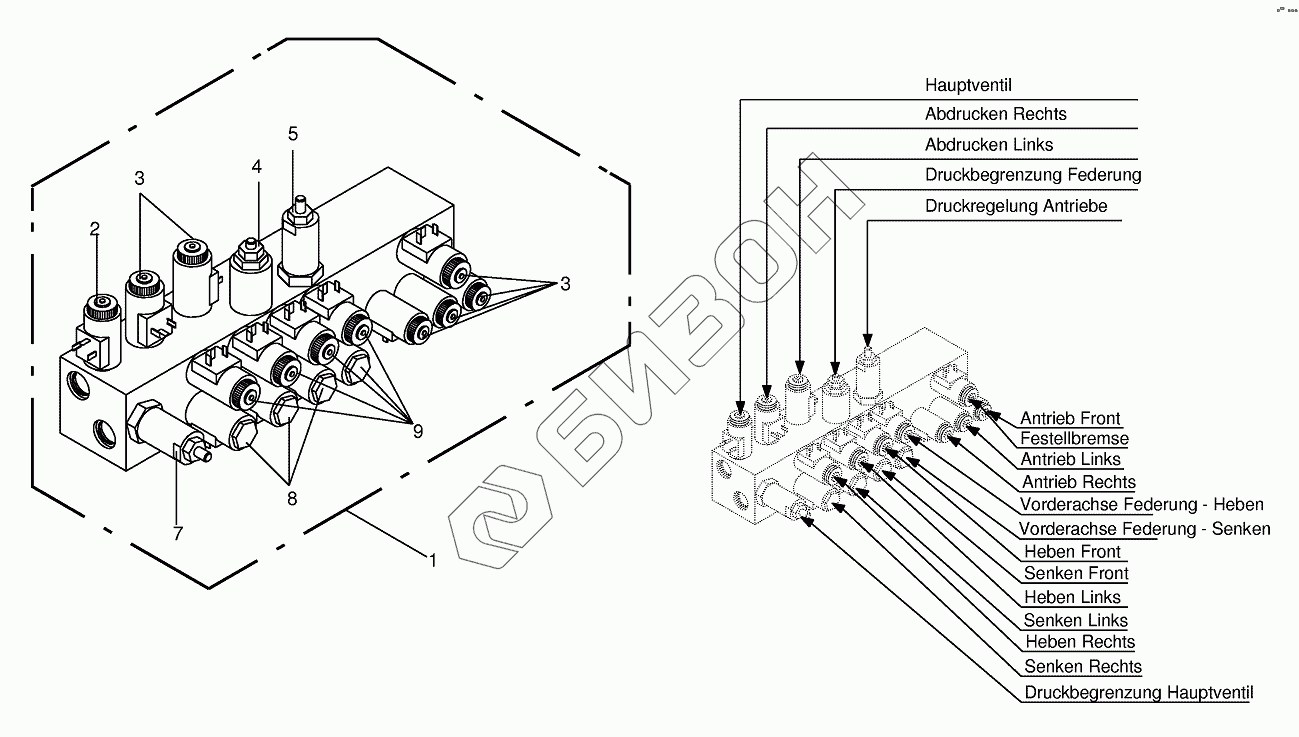Графический каталог запасных частей к технике: KRONE BIG-M-400. Working hydraulics - Valve block