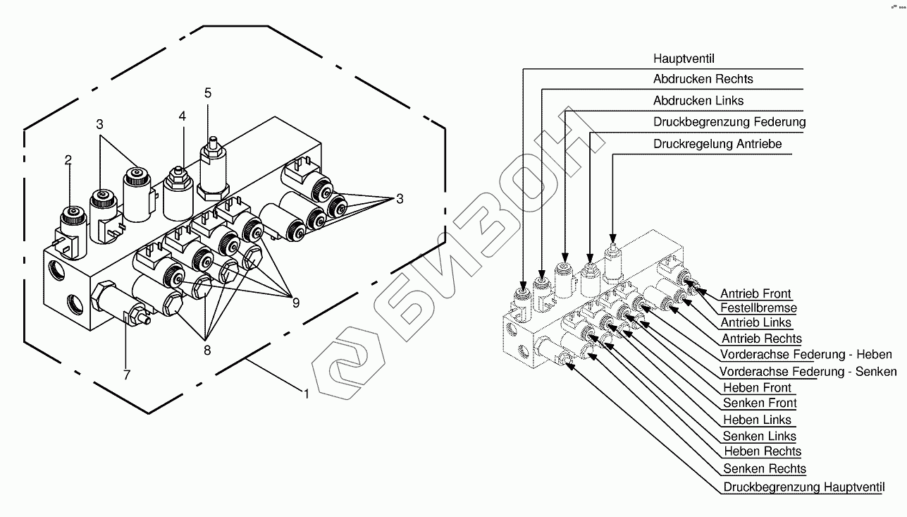 Графический каталог запасных частей к технике: KRONE BIG-M-II. Working hydraulics-Valve block