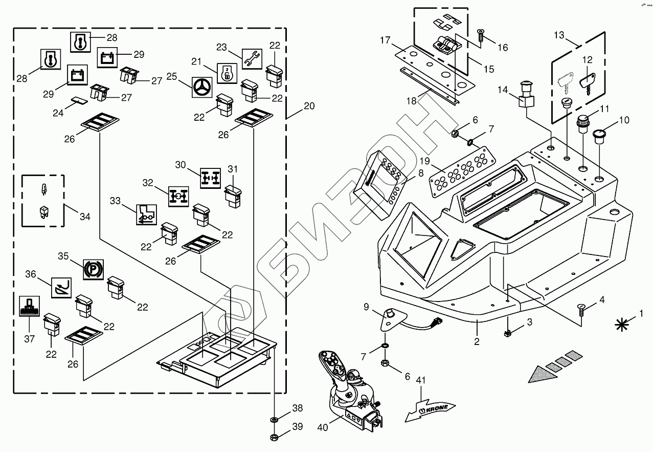 Графический каталог запасных частей к технике: KRONE BIG-X-1000. Control box mounting parts-top