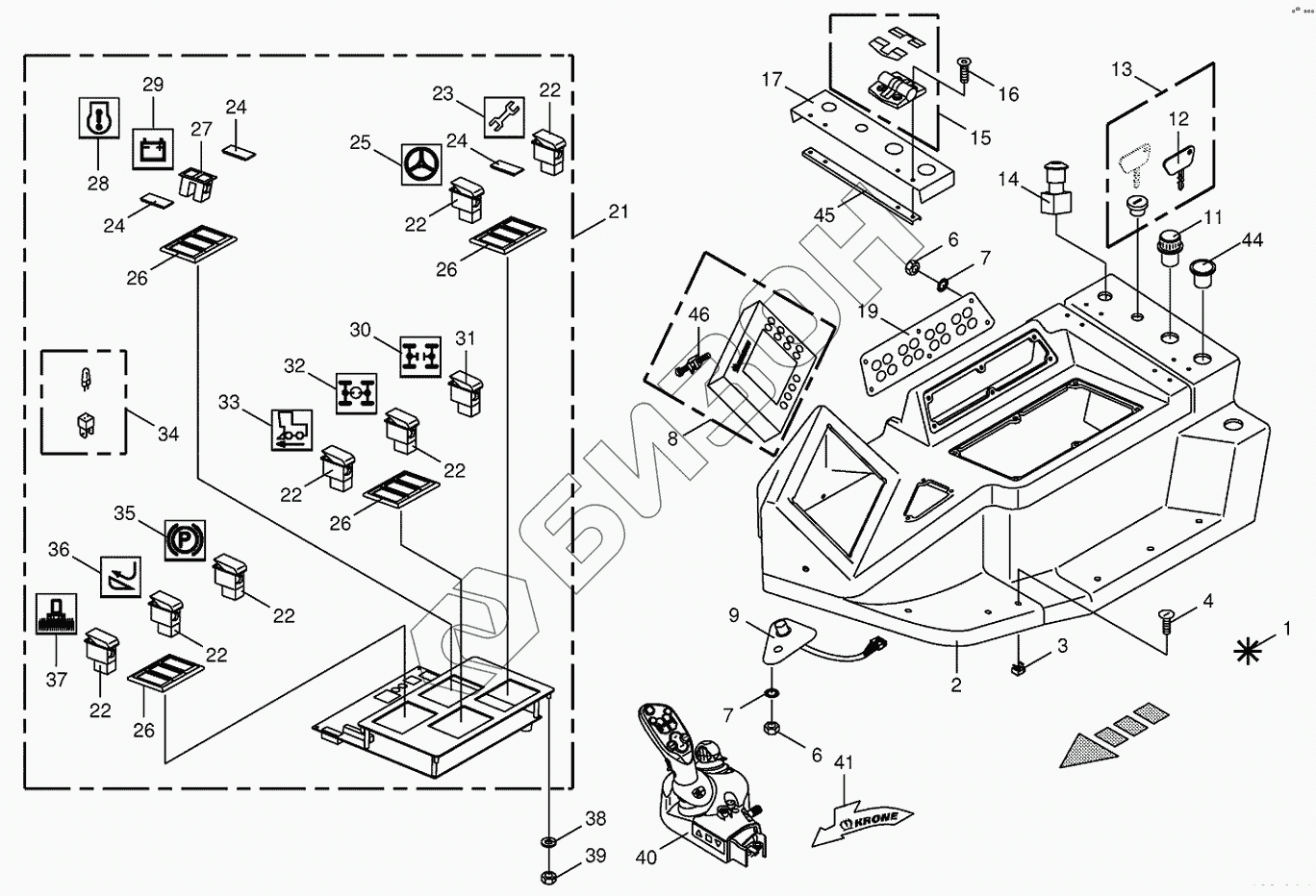 Графический каталог запасных частей к технике: KRONE BIG-X-500. Control box mounting parts-top