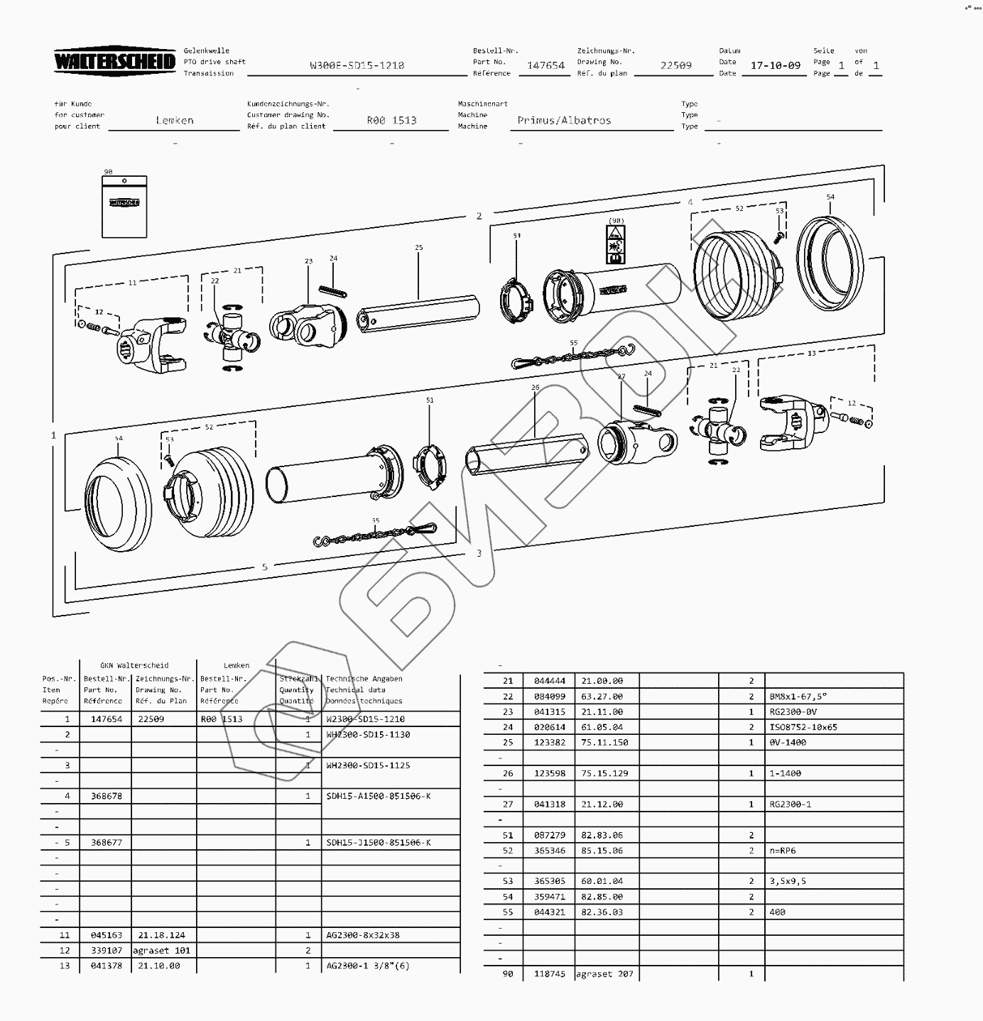 Графический каталог запасных частей к технике: Lemken Primus 10 (Часть 1). R001513 Cardan shaft
