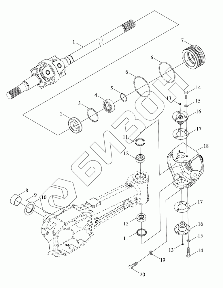 Графический каталог запасных частей к технике: LOVOL TD1SA1054-002K. Полуось левая, цапфа
