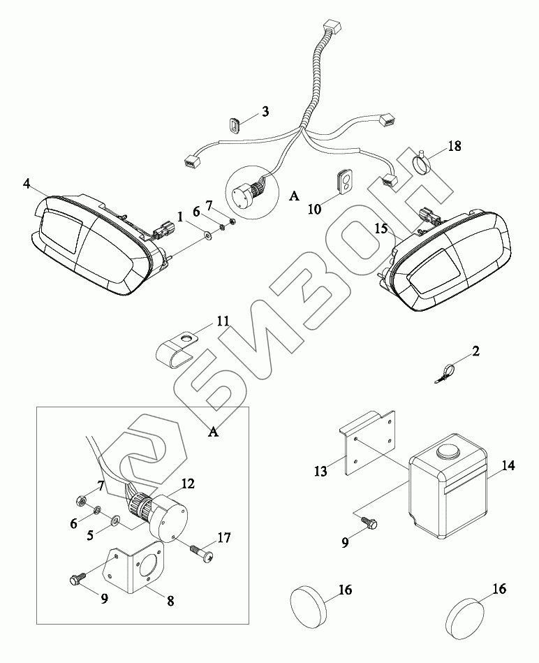 Графический каталог запасных частей к технике: LOVOL TD2SA1304-014K. Монтажный блок жгута провода заднего освещения