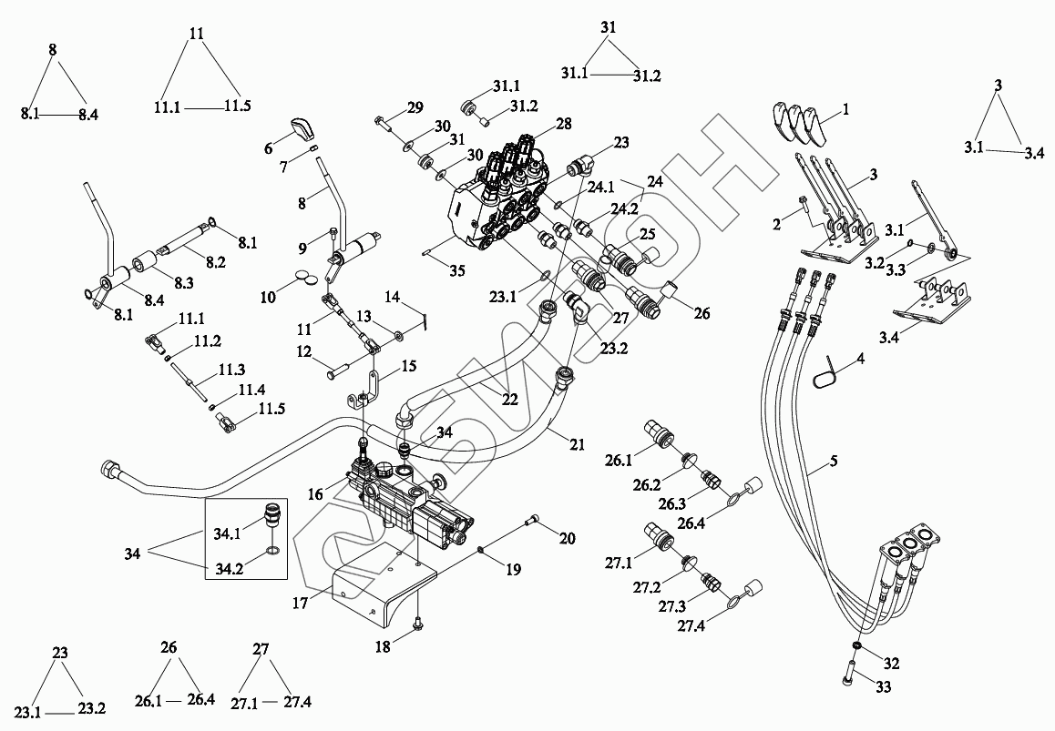 Графический каталог запасных частей к технике: LOVOL TD2SA1304-014K. Устройство гидравлической системы 1