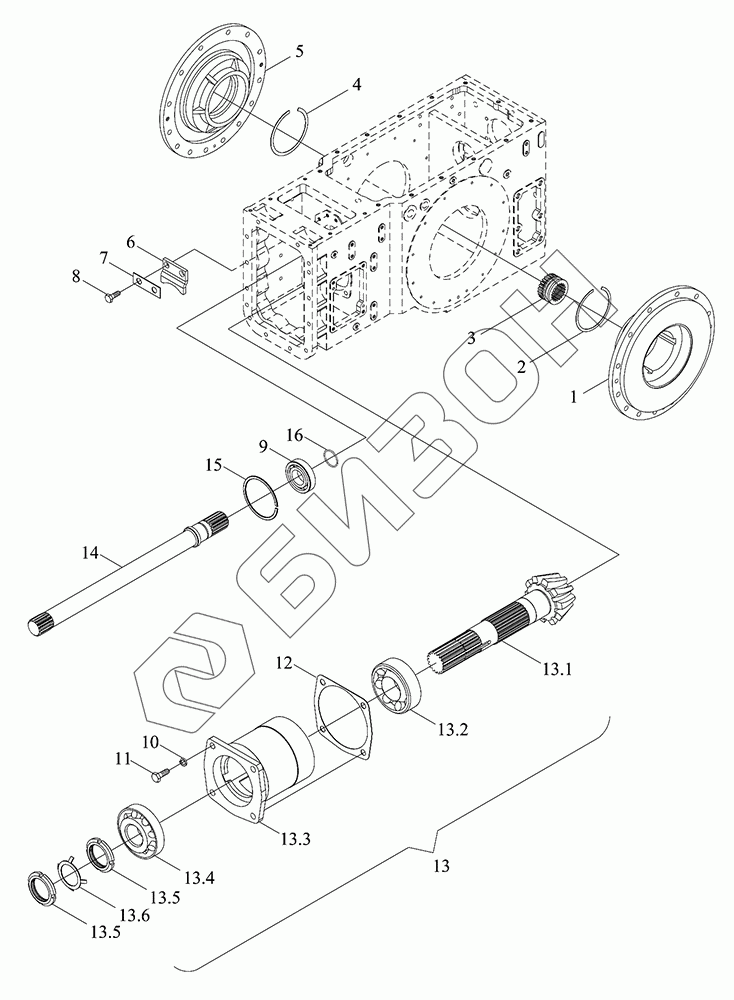 Графический каталог запасных частей к технике: LOVOL TD2SA1304-014K. Корпус, первичный вал, ведущая шестерня