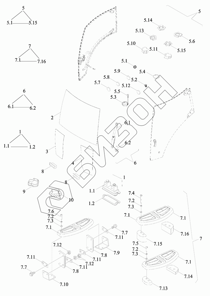 Графический каталог запасных частей к технике: LOVOL TD2SA1304-014K. Стекло лобовое, двери, ступени