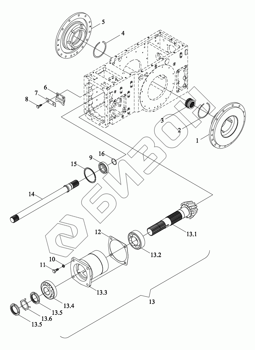 Графический каталог запасных частей к технике: LOVOL TD2SA1304-018K. Корпус, первичный вал, ведущая шестерня