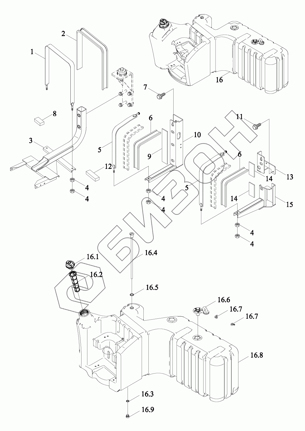 Графический каталог запасных частей к технике: LOVOL TD2SA1304-018K. Бак главный и кронштейн