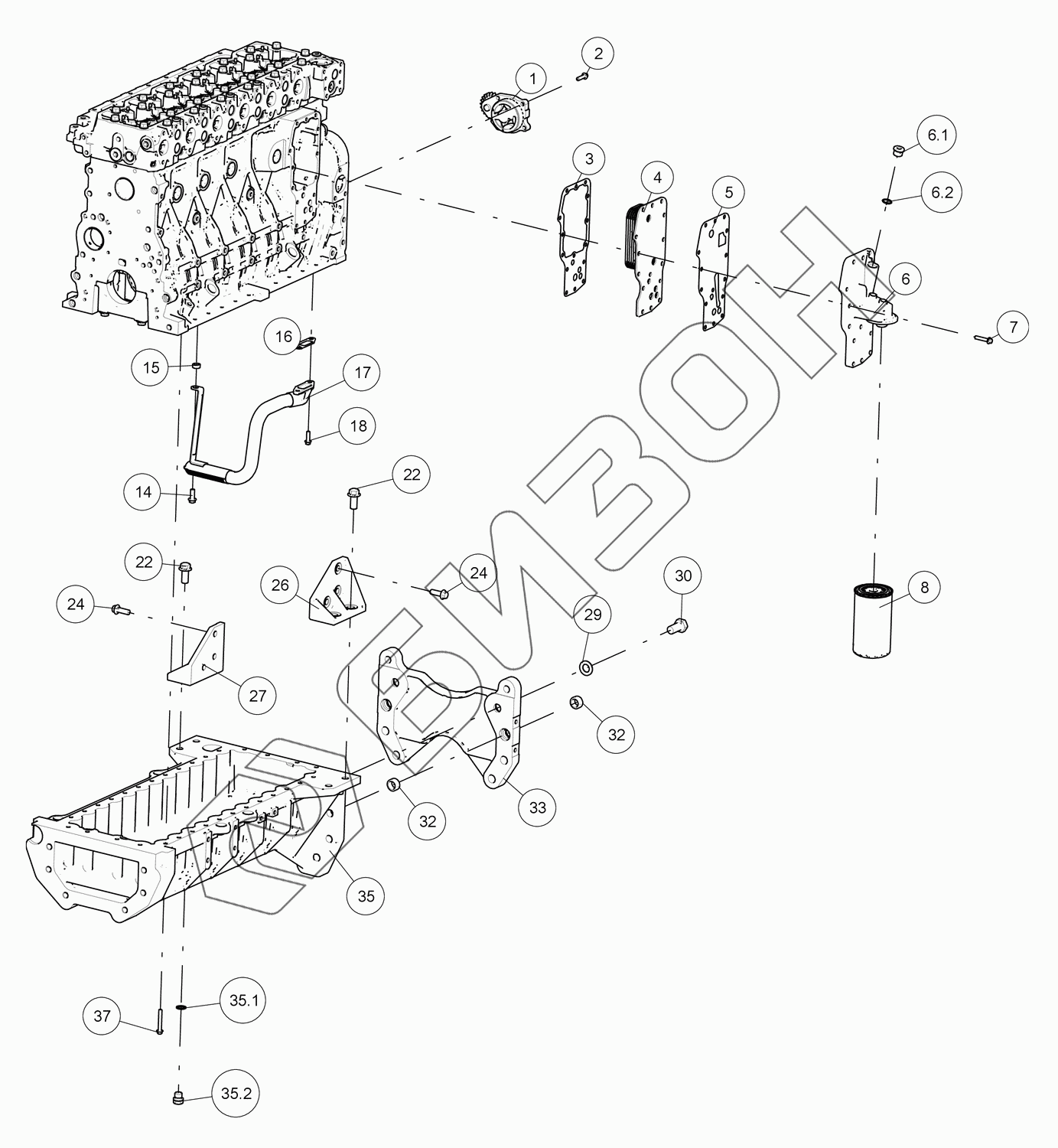 Графический каталог запасных частей к технике: LOVOL TM5D2A1304-001K. Нижняя часть двигателя (поддон)