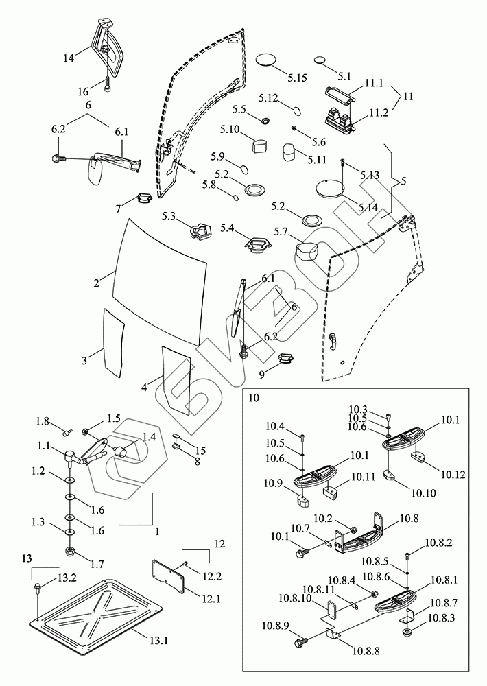 Графический каталог запасных частей к технике: LOVOL TM5D2A1304-001K. Остекление переднее, лестница