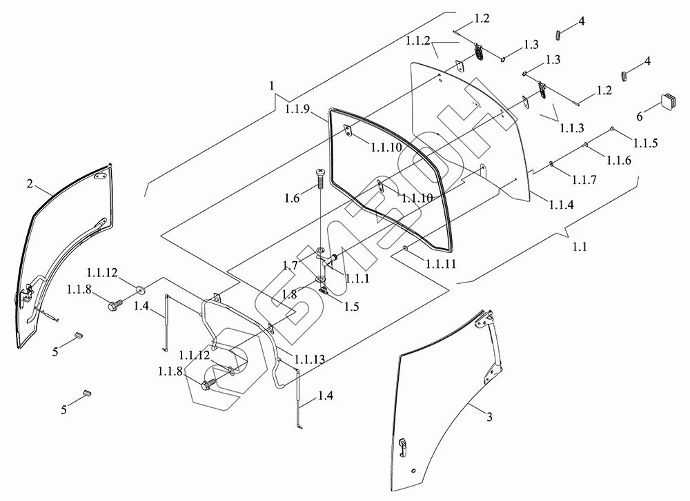 Графический каталог запасных частей к технике: LOVOL TM5D2A1304-001K. Остекление заднее и двери