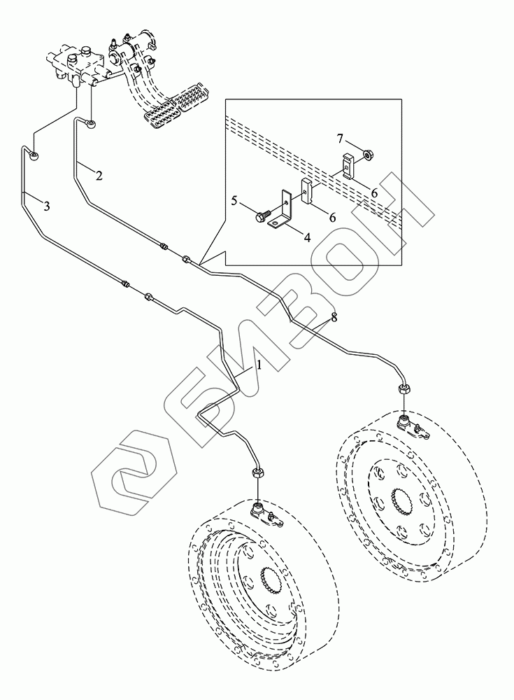 Графический каталог запасных частей к технике: LOVOL TM5D2A1304-002K. Механизм управления рабочими тормозами 1