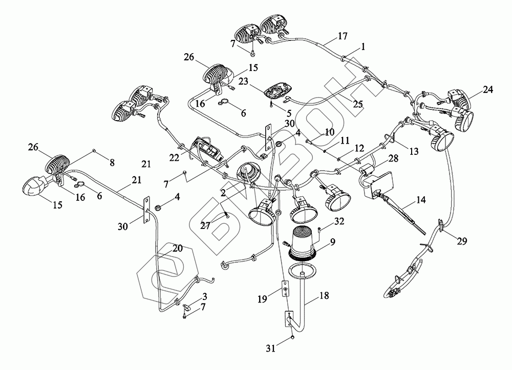 Графический каталог запасных частей к технике: LOVOL TM5D2A1304-006K. Монтажный блок жгута проводов верхнего освещения
