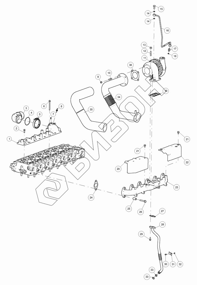 Графический каталог запасных частей к технике: LOVOL TM5D2A1304-006K. Система впуска, турбокомпрессор