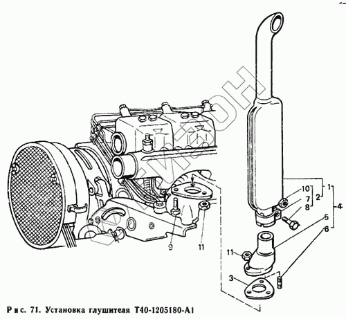 Графический каталог запасных частей к технике: ЛТЗ Т-40М. Установка глушителя Т40-1205180-А1