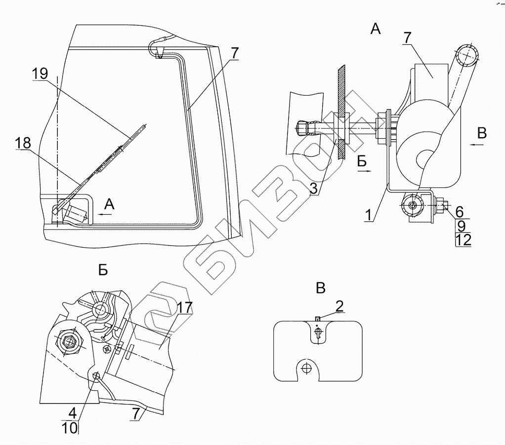 Графический каталог запасных частей к технике: МТЗ 923.4. Установка стеклоочистителя заднего