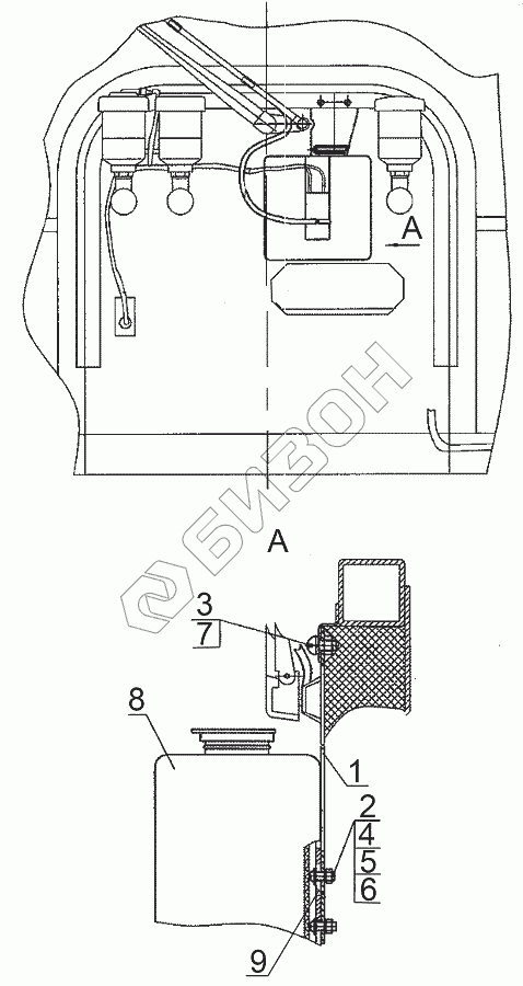 Графический каталог запасных частей к технике: МТЗ БЕЛАРУС 3525. Установка стеклоомывателя переднего 2522-5208010