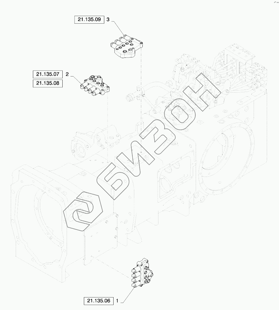 Графический каталог запасных частей к технике: New Holland T8. TRANSMISSION CONTROL VALVE LOCATION