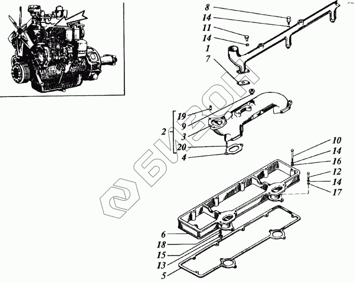 Графический каталог запасных частей к технике: РСМ Дон-1200Б. Труба водяная и коллектор впускной