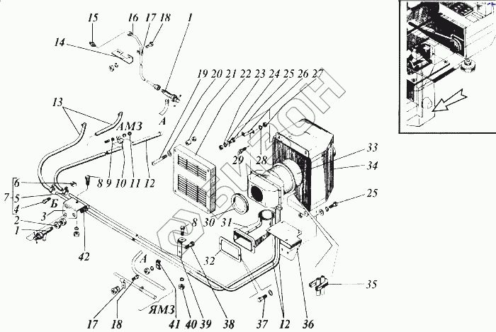Графический каталог запасных частей к технике: РСМ Дон-1200Б. Установка отопителя
