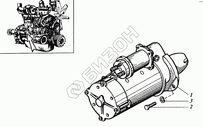 Графический каталог запасных частей к технике: РСМ Дон-1200Б. Установка стартера