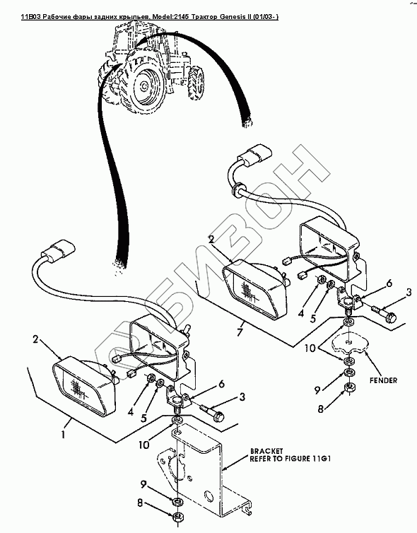 Графический каталог запасных частей к технике: Versatile серии GENESIS. 11B03 Рабочие фары задних крыльев