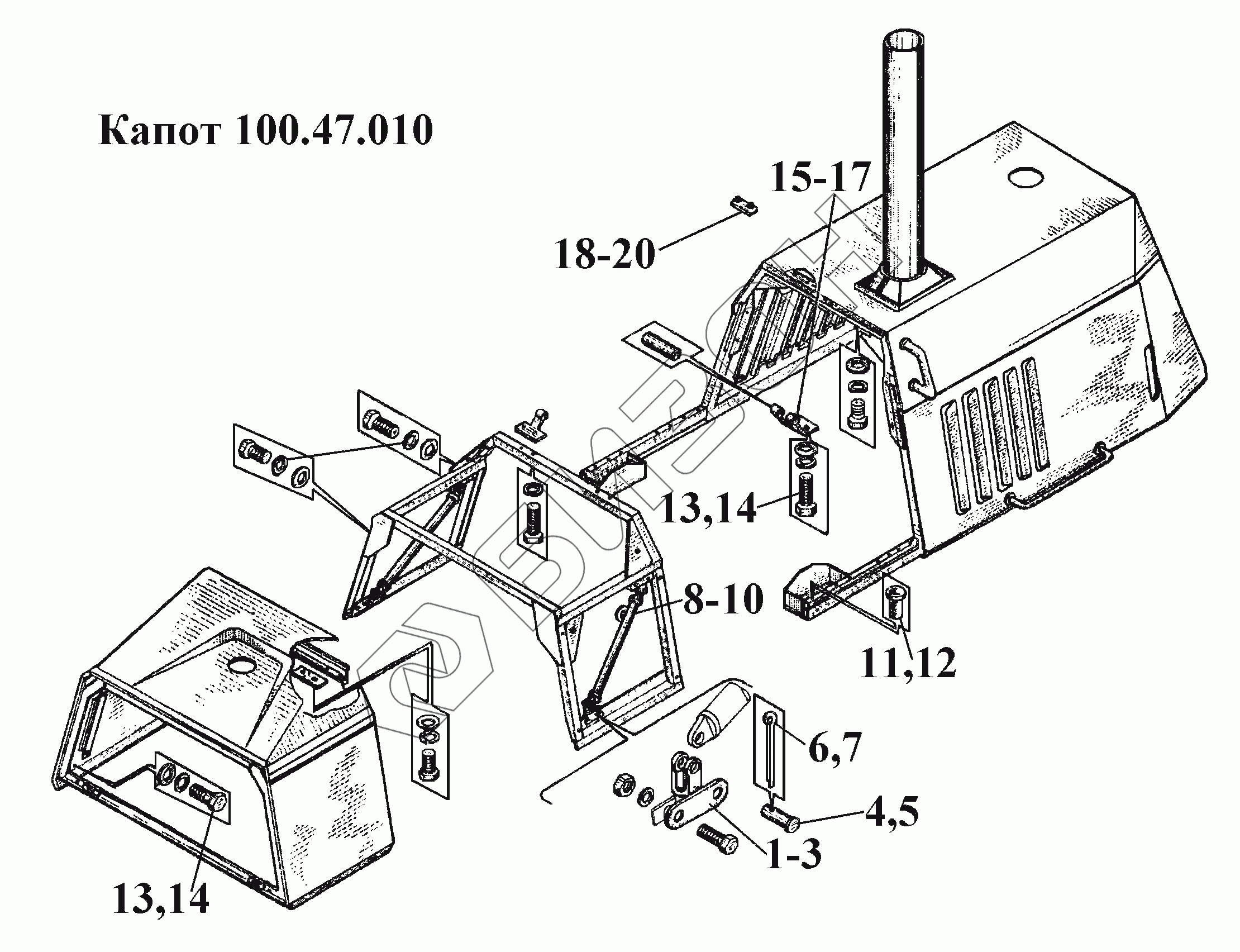 Графический каталог запасных частей к технике: ВгТЗ ВТ-100Д. Капот 100.47.010 (2)