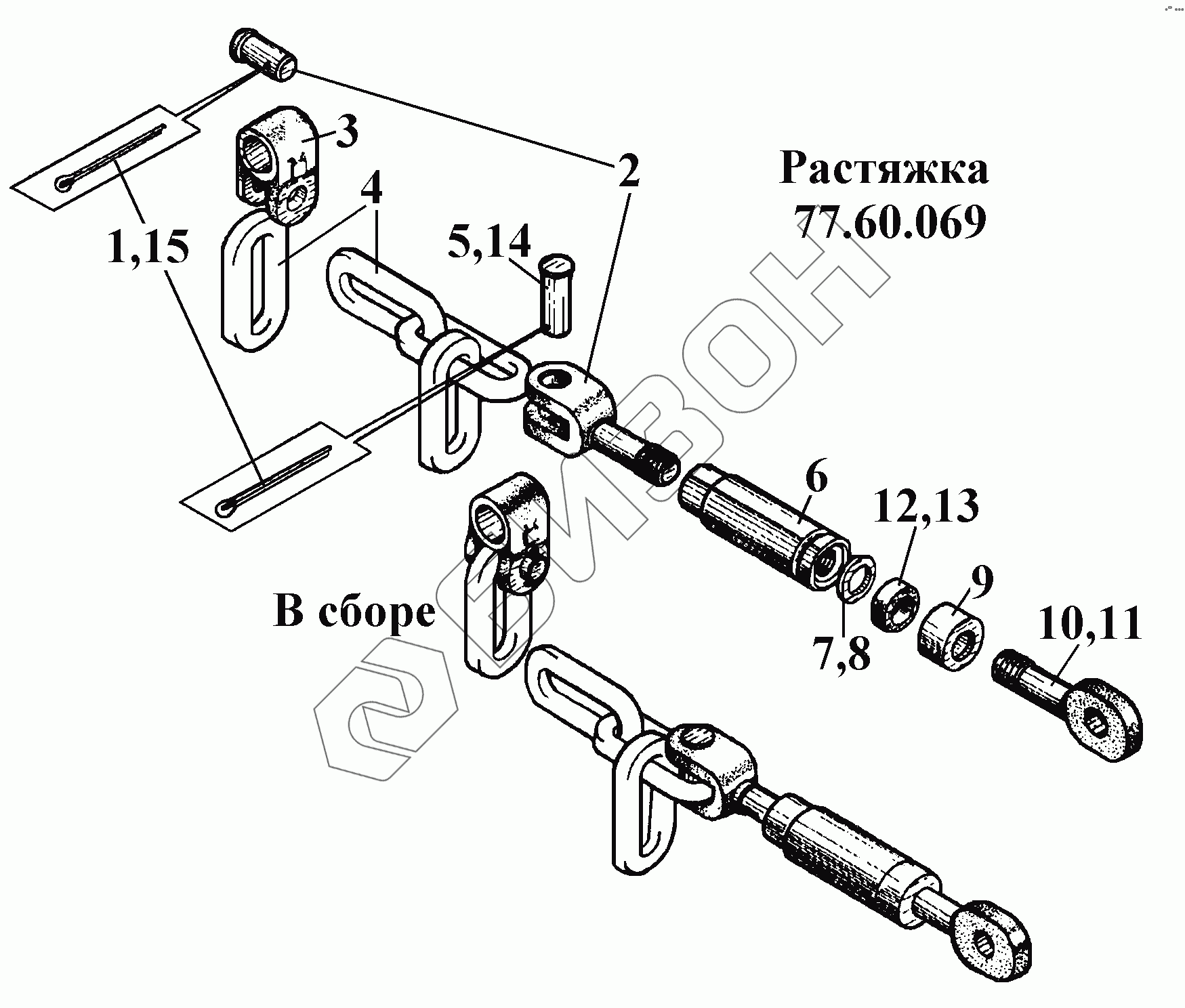 Графический каталог запасных частей к технике: ВгТЗ ВТ-100Д. Растяжка 77.60.069