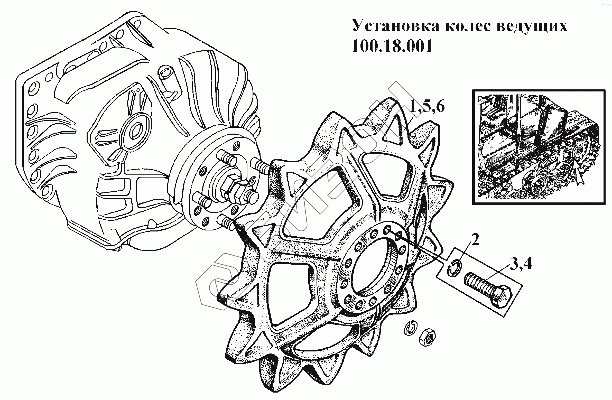 Графический каталог запасных частей к технике: ВгТЗ ВТ-100Д. Установка колес ведущих 100.18.001