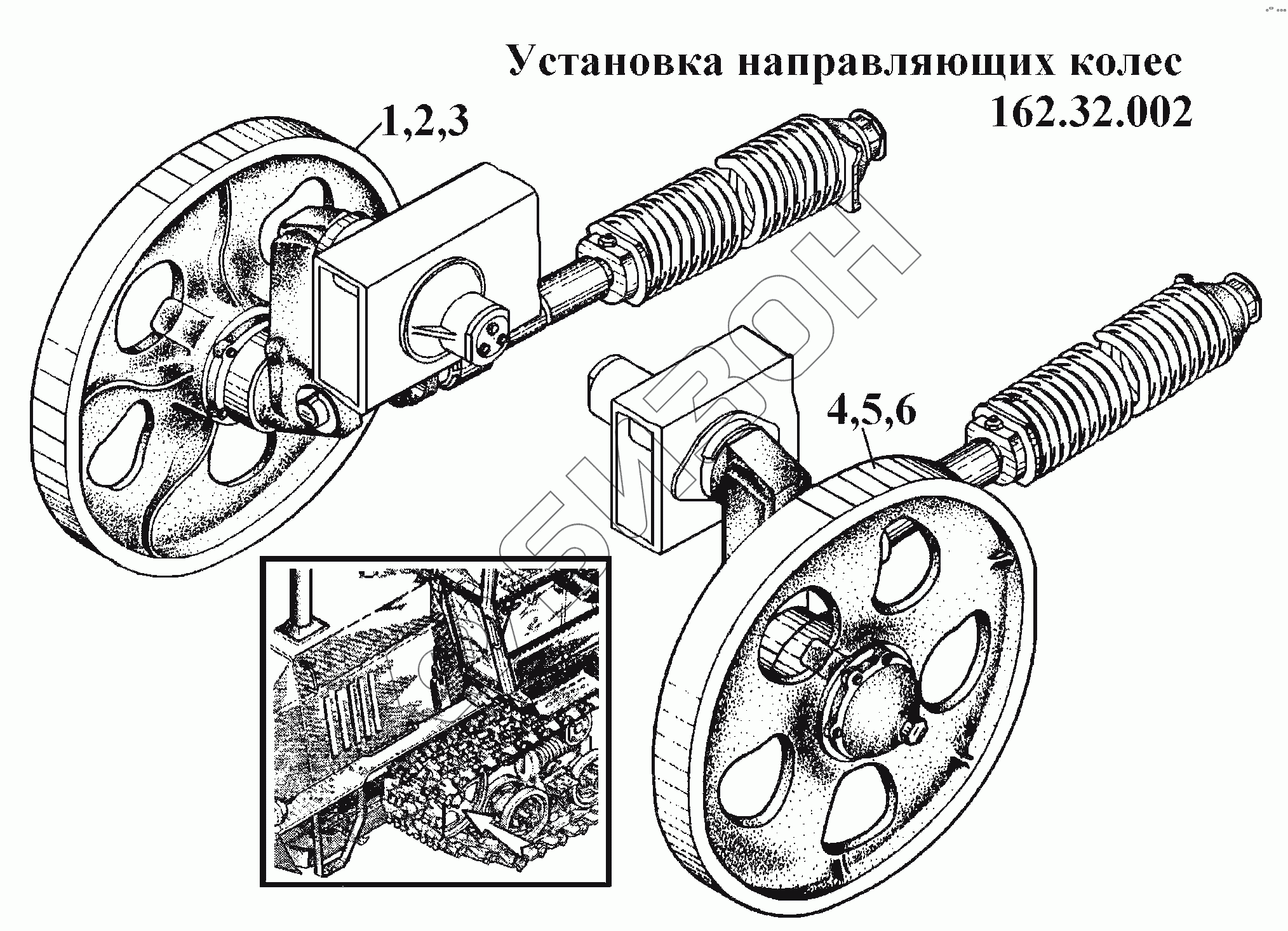 Графический каталог запасных частей к технике: ВгТЗ ВТ-100Д. Установка направляющих колес 162.32.002