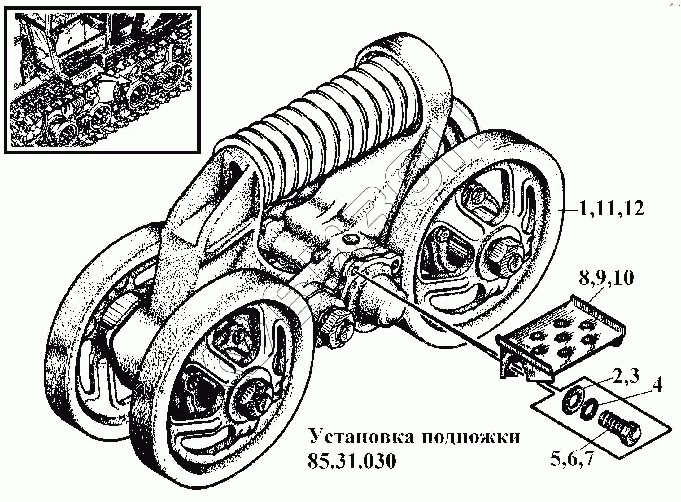 Графический каталог запасных частей к технике: ВгТЗ ВТ-100Д. Установка подножки 85.31.030