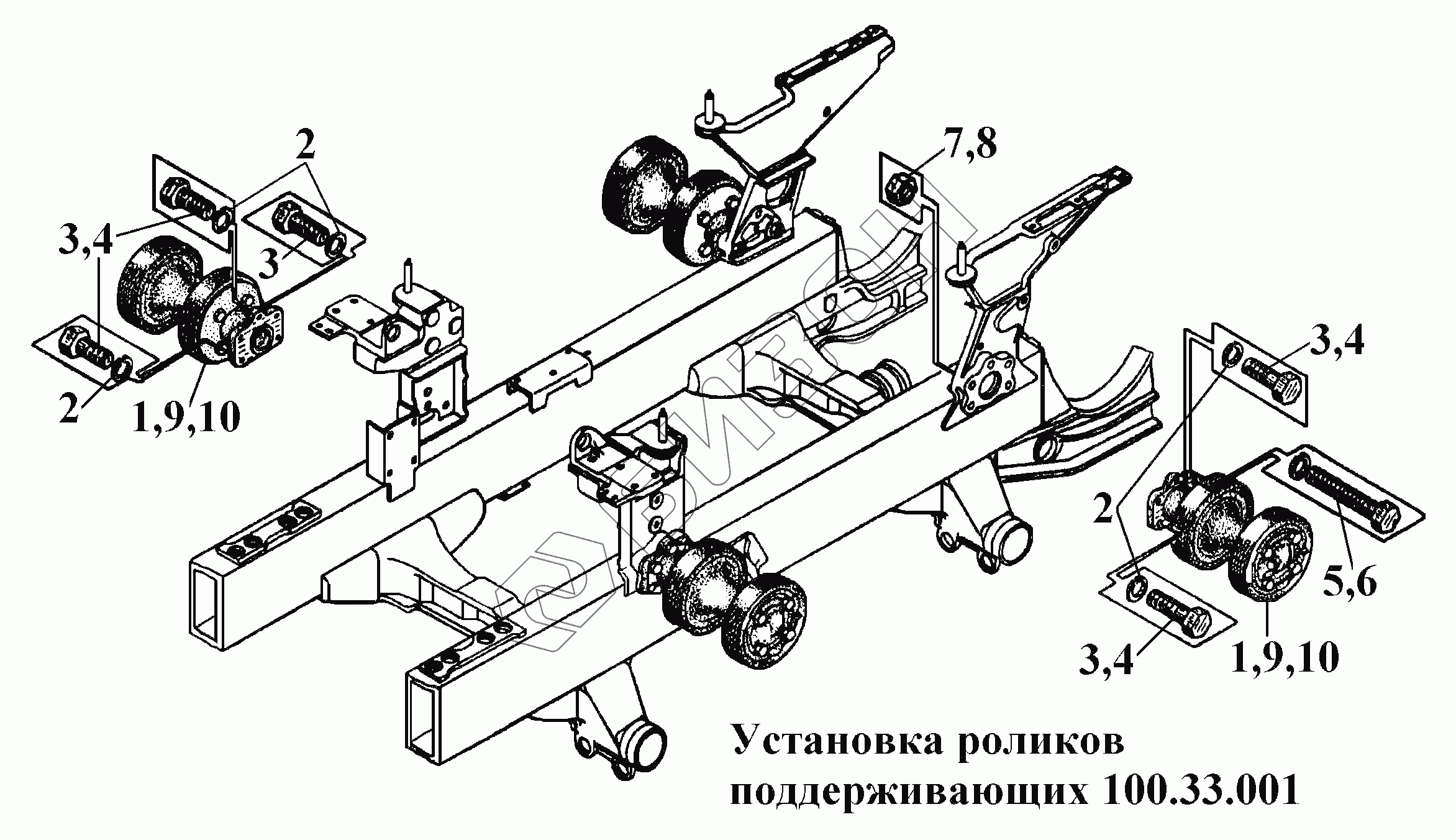 Графический каталог запасных частей к технике: ВгТЗ ВТ-100Д. Установка роликов поддерживающих 100.33.001