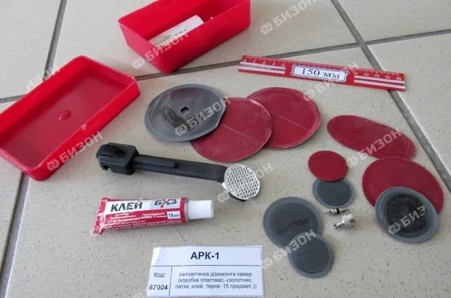 Автоаптечка д/ремонта камер (коробка пластмас.-(золотник, латки, клей, терка- 15 предмет.))