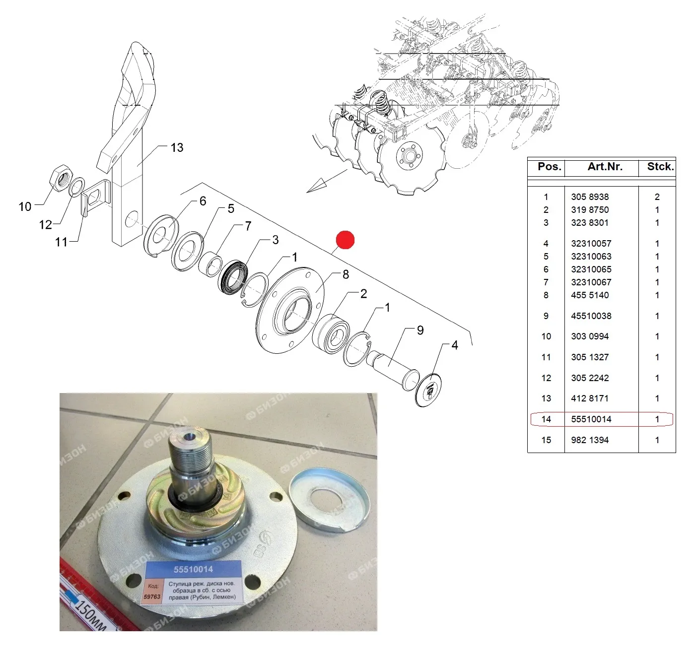 Ступица режущего диска (5отв.) D32х185х155 М30х1,5 RE в сборе (Рубин 10 Лемкен) 55510266
